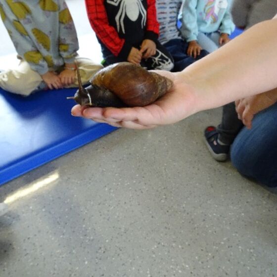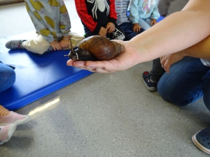 Im September gab es in der Kita ganz besondere Gäste. Passend zum Jahresthema „Tiere“ kam eine Kita-Mutter mit drei Achatschnecken zu Besuch.