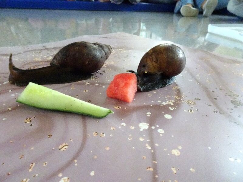 Die Kinder waren ganz aufgeregt, die schimmernden, handgroßen Schnecken kennenzulernen. Gruppenweise konnten die Kinder sich diese vorsichtig anschauen, welche neugierig aus ihrem Gehäuse schauten. Es wurde erklärt, dass Achatschnecken eine besondere Vorliebe für frisches und saftiges Obst und Gemüse haben. Besonders gerne mochten Sie Wassermelone, Paprika und Gurken. Sobald diese Leckereien vor sie gelegt wurden, krochen die Schnecken neugierig darauf zu und begannen die köstlichen Häppchen zu genießen. Die Kinder schauten gespannt zu, waren überrascht, wie groß die Schnecken sind und wie schnell diese das Gemüse essen konnten. Es stellte sich durch ein Experiment heraus, dass die Schnecken keinen Essig mögen. Die Kinder lernten, dass es wichtig ist, den Schnecken nur frische und geeignete Nahrung zu geben, damit sie gesund bleiben. Sie lernten nicht nur viel über die besonderen Bedürfnisse dieser besonderen Tiere, sondern hatten auch jede Menge Spaß beim Beobachten.